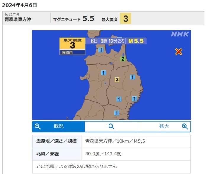 中新網(wǎng)4月6日電 據(jù)日本廣播協(xié)會(huì)(NHK)報(bào)道,當(dāng)?shù)貢r(shí)間6日9時(shí)12分,日本青森縣海域發(fā)生5.5級(jí)地震,震源深度10千米。
