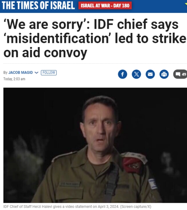 哈萊維表示,以軍無(wú)意傷害“世界中央廚房”援助人員,該事件是“在夜間、在戰(zhàn)爭(zhēng)期間、在非常復(fù)雜的條件下因識(shí)別錯(cuò)誤造成的誤傷”,原本不該發(fā)生。他表示,以軍“對(duì)無(wú)意中傷害到‘世界中央廚房’成員感到抱歉”。