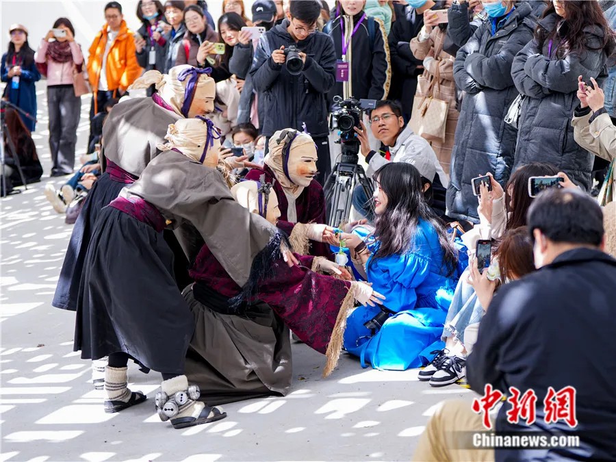 2024年3月28日,2024年世界戲劇日慶典活動中,參加戲劇工坊演出的智利劇團演員與觀眾互動?;顒又鬓k方供圖