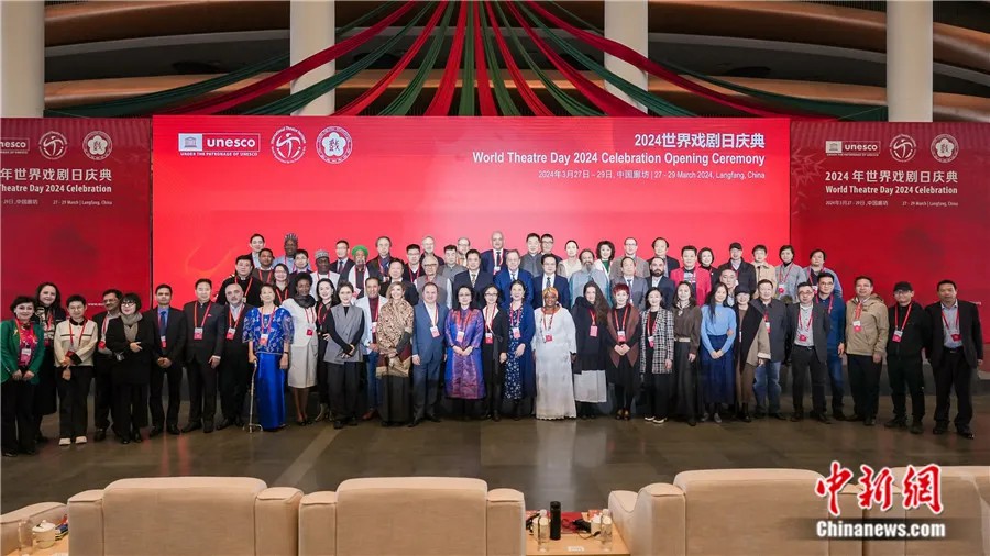 2024年3月27日,在河北廊坊參加2024年世界戲劇日慶典活動的中外嘉賓合影留念?;顒又鬓k方供圖