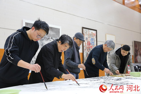 活動(dòng)現(xiàn)場(chǎng),藝術(shù)家們分三組分別創(chuàng)作了兩幅山水畫《銀龍飛馳逐夢(mèng)冬奧》《太行雪霽》和一幅花鳥(niǎo)畫《萬(wàn)象和合》。同時(shí),來(lái)自北京、天津、河北、四川等省內(nèi)外畫家的冬奧題材美術(shù)作品也在現(xiàn)場(chǎng)展出。