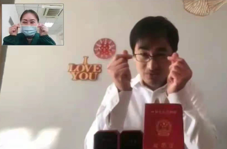 當(dāng)天,這場(chǎng)簡(jiǎn)單而又充滿儀式感的“云上婚禮”悄然進(jìn)行。視頻一頭是在戰(zhàn)“疫”一線的新娘郎峻域,另一頭是居家辦公的新郎陳剛。