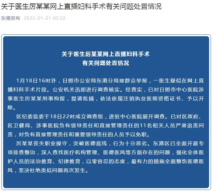 人民網(wǎng)日照1月21日電(聶俊穹)1月21日,山東省日照市東港區(qū)委宣傳部發(fā)布通報稱:1月18日16時許,日照市公安局東港分局接群眾舉報,一醫(yī)生疑似在網(wǎng)上直播婦科手術(shù)片段。日照市公安機關(guān)迅即進行調(diào)查核實。經(jīng)查實,已對日照市中心醫(yī)院涉事醫(yī)生厲某某刑事拘留,提請批捕,依法依規(guī)注銷執(zhí)業(yè)醫(yī)師資格證書、予以開除。