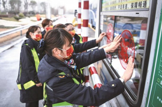 1月24日,在嘉興高速南湖收費站,南湖“紅船”巾幗服務(wù)隊的收費員們裝扮著收費站,向排隊等候取卡的駕駛員發(fā)放“福”字、防疫包和車載垃圾袋,送上一份暖暖的關(guān)愛。春節(jié)期間,收費員們將堅守崗位,用微笑服務(wù)春運,為高速公路暢通保駕護航。(王振宇)