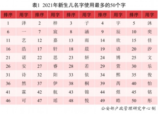 報告顯示,2021年出生并已經(jīng)進行戶籍登記的新生兒名字中,使用頻率最高的50個字依次為澤、梓、子、宇、沐等。