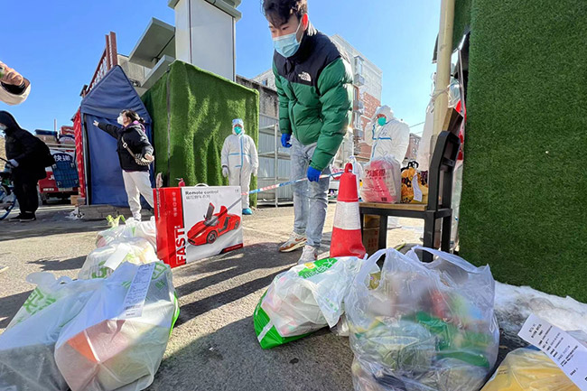 為保障居民買菜用餐等正常生活,院內(nèi)居民可以通過外賣快遞采購物資,也可以通過社區(qū)代為采購。封控區(qū)居民通過快遞外賣的購買物品,會在消殺后,由工作人員送至門口。對不會使用網(wǎng)絡購物的居民,社區(qū)提供了配餐和送貨上門服務。