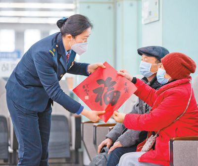 春運(yùn)期間,南京火車站從細(xì)節(jié)著手、小事出發(fā),推出了一系列溫馨服務(wù)?!?58”雷鋒服務(wù)站購置一批適合兒童使用的口罩,教孩子們?nèi)绾握_佩戴,同時為乘車旅客送上春聯(lián)、窗花或“?!弊?。圖為“158”雷鋒服務(wù)站客運(yùn)值班員為旅客送上新春祝福。