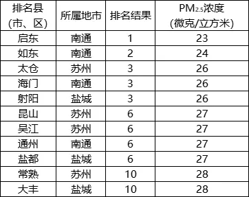PM2.5濃度相對(duì)較好的前10位(1-10名)依次是:?jiǎn)|、如東、太倉(cāng)(海門、射陽并列)、昆山(吳江、通州、鹽都并列)、常熟(大豐并列)。