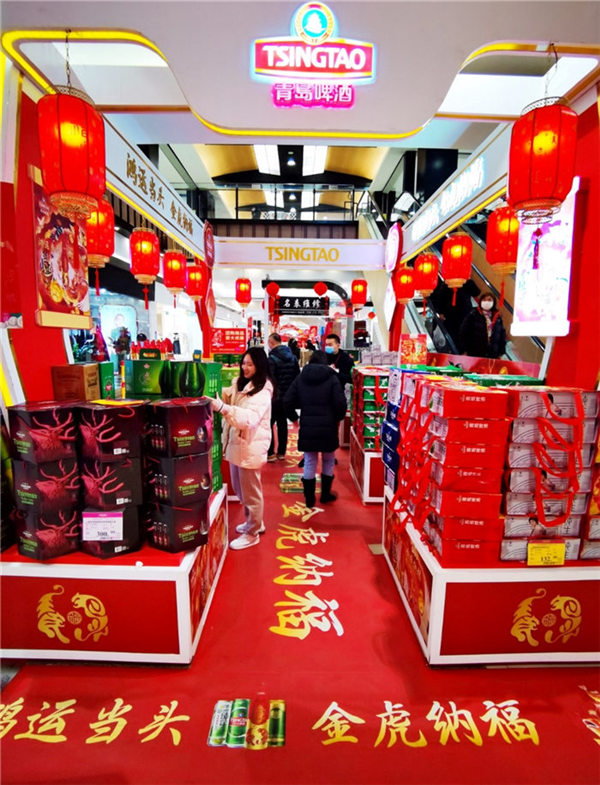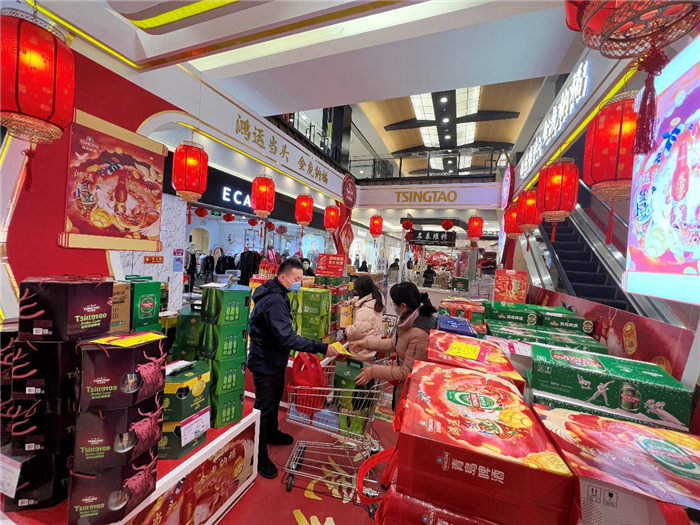 而青島啤酒“百年之旅“憑借獨(dú)一無二的珍惜原材、不惜工本的耗時(shí)慢釀、與無與倫比的琥珀原色和恒久回味,也在春節(jié)超高端市場(chǎng)上有叫好叫座?!比ツ曜咴L客戶就送的‘百年之旅’,有特色又有排面,客戶反饋特別好,今年特地團(tuán)購一批,公司年會(huì)聚餐也喝他?!澳惩赓Q(mào)公司采購部的劉先生,正在和超市的經(jīng)理談大宗采購,作為青島”特產(chǎn)“的青島啤酒,是他們每年過年的首選禮品,”還有今年推出虎年版的百年鴻運(yùn),特別新年應(yīng)景,配上特有的搖擺蓋開起來特別有氣氛,喜慶。“