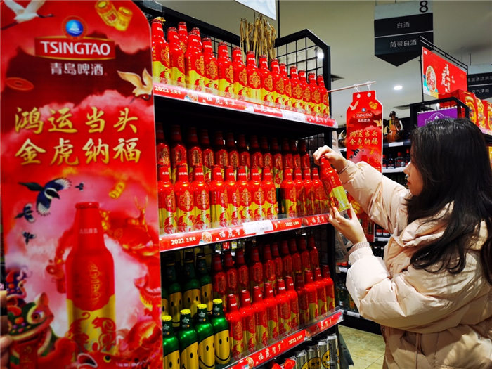 年味不僅是物質(zhì)上的豐富,也有文化上的追求?!斑^年就買‘鴻運(yùn)當(dāng)頭’,圖個(gè)好彩頭?!毕M(fèi)者王先生每年過年都會(huì)“鴻運(yùn)當(dāng)頭,先囤一波”,作為年夜飯的“必選項(xiàng)”?!澳暌癸埍仨毤t紅火火,不管是名字還是包裝,鴻運(yùn)當(dāng)頭就是喜慶,而且酒也好喝,每年還出不同的生肖版,我都收藏著著呢?!痹S多消費(fèi)者表示,這款青島啤酒成為春節(jié)當(dāng)之無愧的“鴻運(yùn)”年貨,走親訪友拎上一提,年味就出來了。