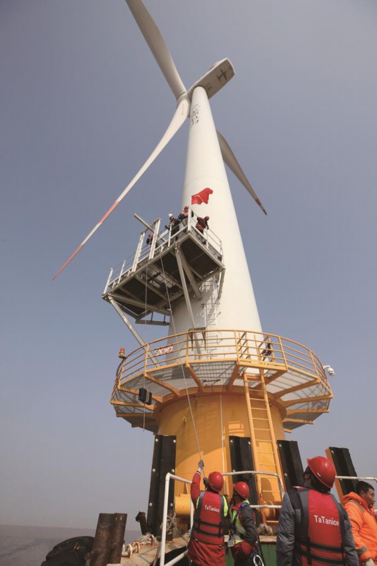 經(jīng)過一個(gè)多小時(shí)的航行,運(yùn)輸船順利到達(dá)位于風(fēng)場最外圍的一臺(tái)風(fēng)機(jī)旁邊,一個(gè)個(gè)組裝好的設(shè)備“整裝待發(fā)”。在運(yùn)輸船平穩(wěn)靠近風(fēng)機(jī)后,兩名做好防護(hù)措施的施工人員率先爬上梯子,到達(dá)第二層風(fēng)機(jī)平臺(tái)后,兩人迅速在護(hù)欄上固定好滑輪,與運(yùn)輸船上的施工人員相互配合,將所有設(shè)備“運(yùn)輸”到平臺(tái)上(見右圖 記者 江建華攝)。