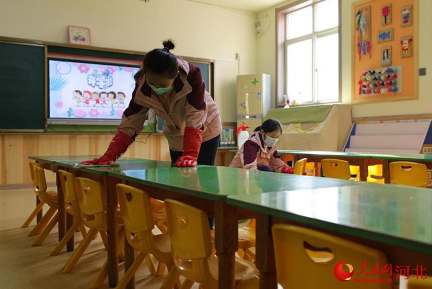 河北省邢臺(tái)市廣宗縣第一幼兒園,教職工在對(duì)教室進(jìn)行清潔消毒。 王壘攝
