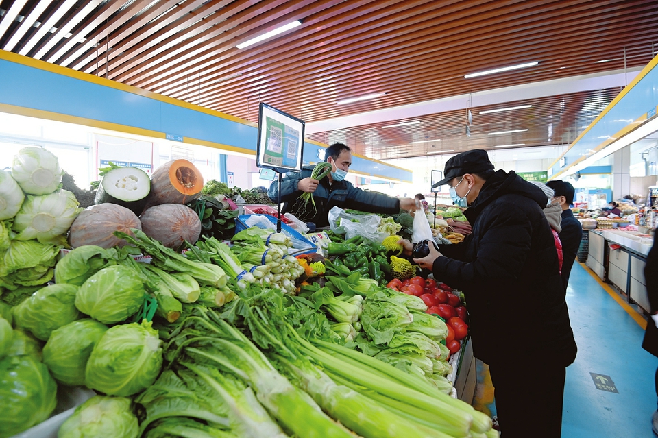 3月2日,太原市迎澤區(qū)惠民市場內(nèi),市民正在購買蔬菜。據(jù)了解,該市場嚴(yán)格執(zhí)行疫情防控措施,目前市場內(nèi)菜價(jià)平穩(wěn)、貨源充足,有效保障轄區(qū)居民的生活需求。(記者阮洋攝)
