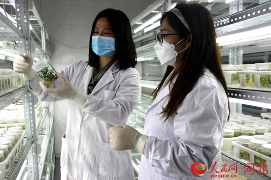 定州市綠谷農(nóng)業(yè)科技發(fā)展有限公司工作人員在無菌培養(yǎng)室察看新型育苗的長(zhǎng)勢(shì)情況。 周永攝