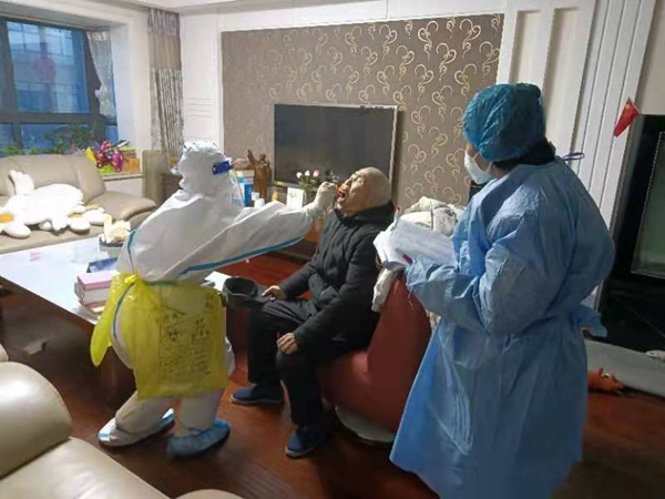 孫麗群(右)與醫(yī)護(hù)人員一同上門(mén)為居家老人做核酸檢測(cè)。受訪者供圖