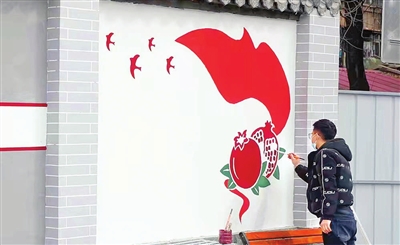 圖為專業(yè)人員對墻體進(jìn)行主題彩繪。朱明鑰 李朋林 攝影報(bào)道