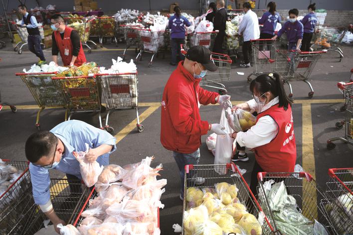 3月29日,在嘉興市區(qū)一超市秀洲店,店員們加班加點打包蔬菜、肉、油等1500份物資。這些物資將被送到“三區(qū)”,保障群眾的日常生活需求。(王振宇)