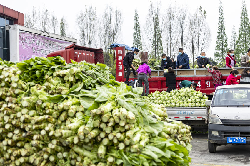 散發(fā)著清香氣息的萵筍,品質(zhì)一流的蓮花白、土豆、生菜、蘿卜,還有都江堰特產(chǎn)大蔥以及時下當?shù)刈钚迈r的春筍等,經(jīng)過嚴格的農(nóng)產(chǎn)品安全檢測后,被裝上了愛心運輸車輛。
