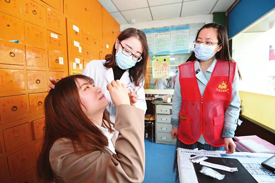 4月6日,太原市迎澤區(qū)老軍營社區(qū)衛(wèi)生服務站內(nèi),老軍營二社區(qū)工作人員和衛(wèi)生服務站的醫(yī)護人員在學習使用新冠抗原檢測試劑,掌握使用方法和檢測結(jié)果確認方式。當日,老軍營二社區(qū)與社區(qū)衛(wèi)生服務站聯(lián)合引入新冠抗原檢測試劑,組織工作人員學習使用,以便試劑下發(fā)居民之后快速教授居民使用方法。(記者阮洋攝)