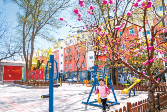 大興區(qū)興豐街道老小區(qū)黃村西里社區(qū)在居民的共同維護(hù)下,居住環(huán)境整潔舒適。圖為提升后的社區(qū)廣場(chǎng)上,小朋友正在樂享春光。本報(bào)記者 武亦彬攝