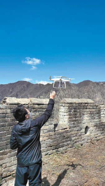 翼展近2米的固定翼無人機(jī)、搭載著5個鏡頭的傾斜攝影無人機(jī)、白色的小型無人機(jī)……4月14日早上,記者驅(qū)車下了京承高速、經(jīng)過雁棲島,又走了30多公里盤山路,來到被箭扣長城環(huán)抱的雁棲鎮(zhèn)西柵子村。村西長城腳下,五架無人機(jī)一字排開,技術(shù)人員正在組裝調(diào)試。當(dāng)天,它們分工合作在長城內(nèi)外、上下進(jìn)行拍攝、采集數(shù)據(jù)。