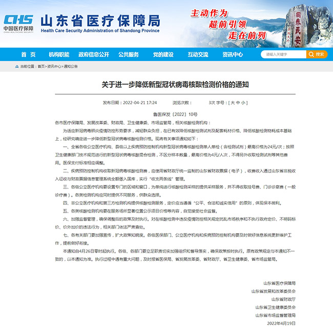 為適應(yīng)新冠病毒肺炎疫情防控形勢要求,減輕群眾負(fù)擔(dān),在已有效降低核酸檢測試劑及配套耗材價格、降低核酸檢測物耗成本基礎(chǔ)上,進(jìn)一步降低新型冠狀病毒核酸檢測價格。山東省各級公立醫(yī)療機(jī)構(gòu)、縣級以上疾病預(yù)防控制機(jī)構(gòu)新型冠狀病毒核酸檢測單人單檢(含檢測試劑)最高價格為24元/次;按照衛(wèi)生健康部門技術(shù)規(guī)范進(jìn)行的新型冠狀病毒核酸混合檢測,不區(qū)分樣本數(shù)量,最高價格為4元/人次,不得另外收取檢測試劑等其他費用。