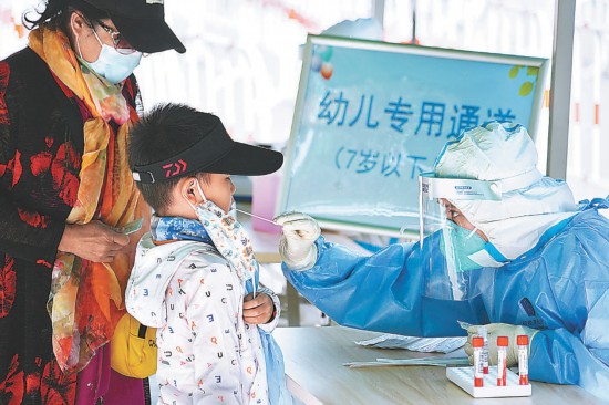 昨天(5月7日),朝陽區(qū)啟動(dòng)新一輪大規(guī)模核酸檢測(cè)。為方便居民進(jìn)行核酸采樣,減少交叉幾率,朝陽區(qū)小關(guān)街道奧林匹克文化廣場(chǎng)核酸檢測(cè)點(diǎn)設(shè)置“幼兒專用通道”,專為7歲以下兒童提供核酸檢測(cè)服務(wù)。本報(bào)記者 程功攝