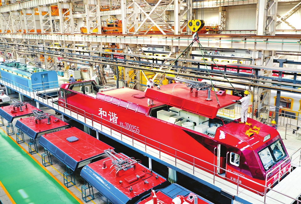 5月20日,在中車太原公司和諧型機車總組裝生產(chǎn)線,工人們正在吊裝電力機車頂蓋。今年以來,中車太原公司克服疫情對生產(chǎn)的影響,強化跟蹤工序進(jìn)度,全面排查整治安全質(zhì)量薄弱環(huán)節(jié),確保各個工序安全高效、工藝質(zhì)量可靠。目前,公司已實現(xiàn)電力機車檢修產(chǎn)品交直流并舉的重大跨越。(記者劉通攝)