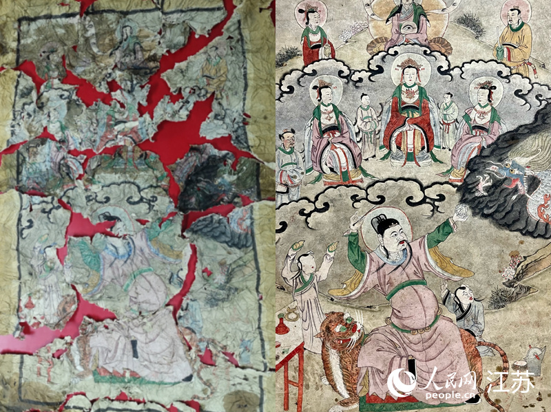 前后三個月時間里,她幾乎每天工作12小時,毛筆、糨糊、排筆、噴壺、棕刷……輪流上陣,只為撫平褶皺,拼合裂痕。最終,陳思燚“妙手回春”,讓188個紙漿團(tuán)殘片,還原成了一幅長1.55米、寬0.6米的人物彩畫。陳思燚說,“這幅畫被撕成碎片,團(tuán)成一團(tuán)后環(huán)境相對封閉,一定程度上減弱了畫心顏色流失,能讓我最大限度地還原,這讓我很有成就感?!?/p>