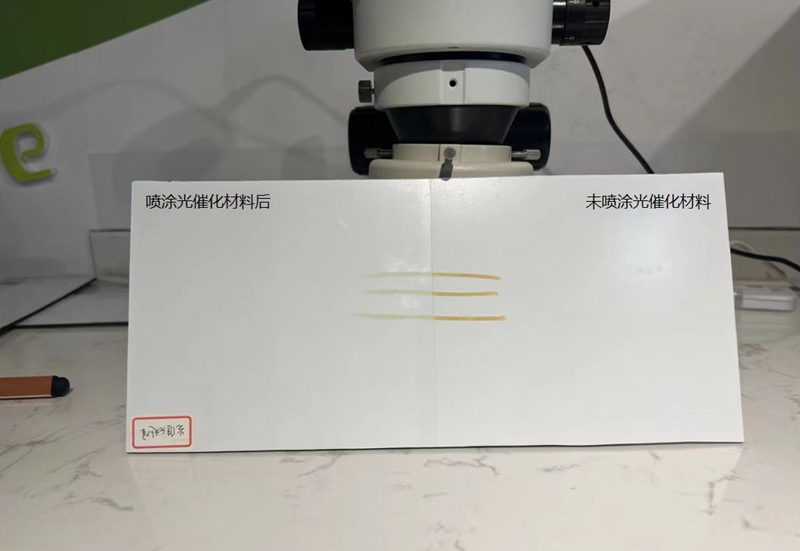 “將一塊鋁面板一分為二,一塊噴涂光催化涂膜,另一塊不噴涂。用有機染料筆模仿外界污染物,在兩塊材料表面標(biāo)記后,通過一分鐘紫外光燈照射,可看出噴涂了光催化涂膜的瓷磚鋁板部分染料降解效果明顯更高?!惫ぷ魅藛T告訴人民網(wǎng)浙江頻道,根據(jù)國家權(quán)威檢測機構(gòu)的實驗證明,每噴涂1立方米的光催化涂膜,就能清除95%的甲醛。