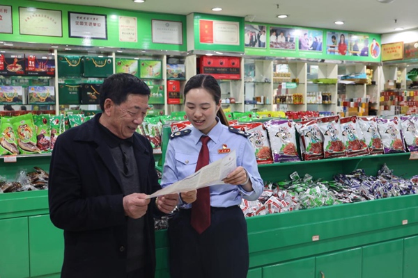 城口縣稅務(wù)人員為企業(yè)負(fù)責(zé)人講解新的組合式稅費(fèi)支持政策。廖欣玥攝