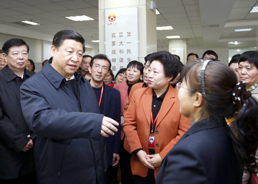 2013年11月27日下午,中共中央總書記、國家主席、中央軍委主席習(xí)近平在濟南市外來務(wù)工人員綜合服務(wù)中心同從事家政服務(wù)的“陽光大姐”交流。新華社記者鞠鵬攝