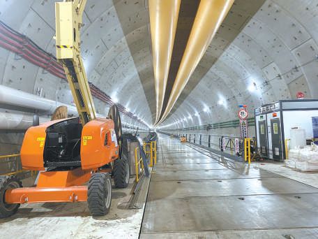 走進(jìn)項目工地,沒有想象中的機(jī)械轟鳴聲,施工現(xiàn)場位于幾十米深的地下。記者從地面乘坐直梯,順著盾構(gòu)機(jī)始發(fā)井,來到地下26米處的西線隧道內(nèi)。國產(chǎn)最大直徑泥水平衡盾構(gòu)機(jī)“京華號”,已在西線隧道里向前掘進(jìn)了近4000米。眼前的西線隧道,蜿蜒著向南延伸。開工初期,記者從始發(fā)井步行幾分鐘即可抵達(dá)盾構(gòu)機(jī)駕駛艙位置;這次采訪,施工方特意安排了1輛純電動代步車?!艾F(xiàn)在盾構(gòu)機(jī)離始發(fā)井有些遠(yuǎn),工作人員上下班都得坐車?!瘪{駛員說,這輛電動代步車是用吊車吊到隧道內(nèi)的,還特意為它在隧道里安了充電樁,“這輛車再回到地面,就得是隧道貫通的時候啦!”