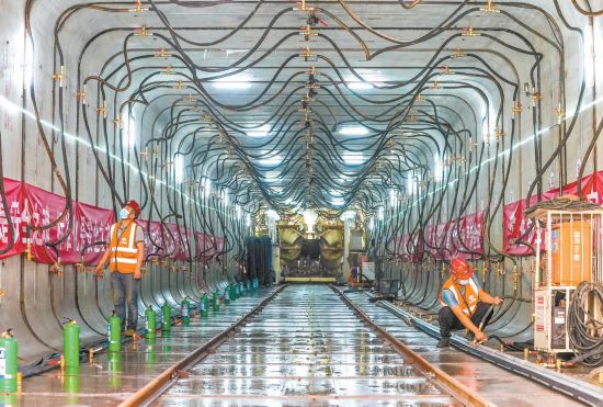 記者在施工現(xiàn)場看到,這臺特制的矩形頂管機,寬6.9米、高4.9米,采用6刀盤切削土方,隧道一次成型,施工安全得到有效保障,質(zhì)量顯著提高。隨著掘進設(shè)備刀盤快速轉(zhuǎn)動,前方的砂石和土層被攪碎排出,打通施工空間?;炷令A(yù)制管片被吊裝設(shè)備運至地下,放在安裝位置上。