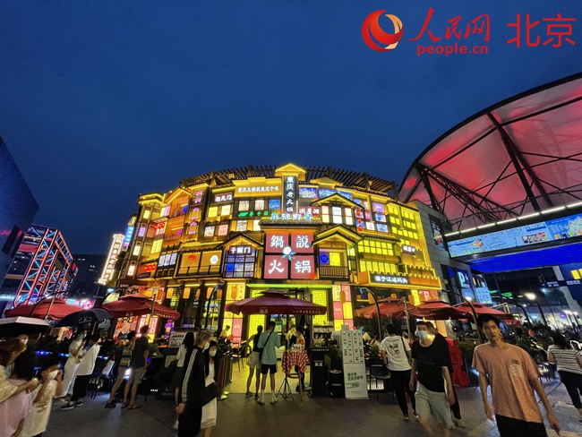 雖是工作日傍晚,剛過6點(diǎn),華熙LIVE·五棵松的街區(qū)上人已熙熙攘攘,要想嘗嘗網(wǎng)紅餐廳,已經(jīng)需要拿號(hào)等位了。順著香味一路走,一家裝潢極具重慶吊腳樓特色的火鍋店十分引人注目,成了夜景打卡地,飄香的麻辣味也勾起了不少食客的“饞蟲”。