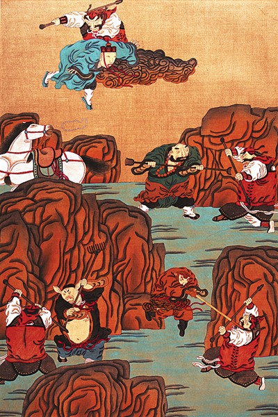 《西游記·車遲國》是周京新“西游”系列中的一幅,描繪了唐僧師徒取經路上路過車遲國,與虎力、鹿力、羊力三個妖怪斗法的場景。在他的創(chuàng)作中,中國畫的工筆與寫意并非涇渭分明,體現(xiàn)了“以工養(yǎng)寫”的思考,人物造型緊湊結實而又不乏詼諧的生趣,山石樹木屋宇乃至黑霧祥云均有裝飾意趣。