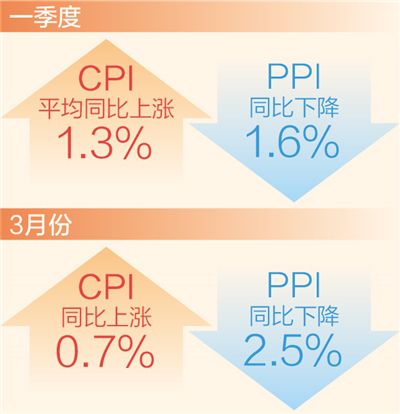 本報北京4月11日電 (記者劉志強)國家統(tǒng)計局11日發(fā)布數(shù)據(jù)顯示:3月份,CPI(居民消費價格指數(shù))同比上漲0.7%,漲幅比上月回落0.3個百分點;PPI(工業(yè)生產(chǎn)者出廠價格指數(shù))同比下降2.5%,降幅比上月擴大1.1個百分點。從一季度看,CPI平均同比上漲1.3%,PPI同比下降1.6%。一季度CPI持續(xù)運行在合理區(qū)間,物價保持平穩(wěn)運行,為全年物價穩(wěn)定奠定了堅實基礎(chǔ)。