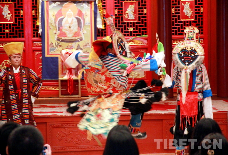 中國西藏網訊 記者自中國工藝美術館(中國非物質文化遺產館)獲悉,6月3日至4日,該館“遇見非遺”社教活動邀請到了西藏自治區(qū)拉薩市城關區(qū)娘熱民間藝術團為觀眾展示來自雪域高原的藝術瑰寶——藏戲(拉薩覺木?。?、拉薩囊瑪和嘎爾。三個項目都是國家級非物質文化遺產。圖為拉薩市城關區(qū)娘熱民間藝術團表演的藏戲開場《溫巴頓》片段 攝影:劉莉