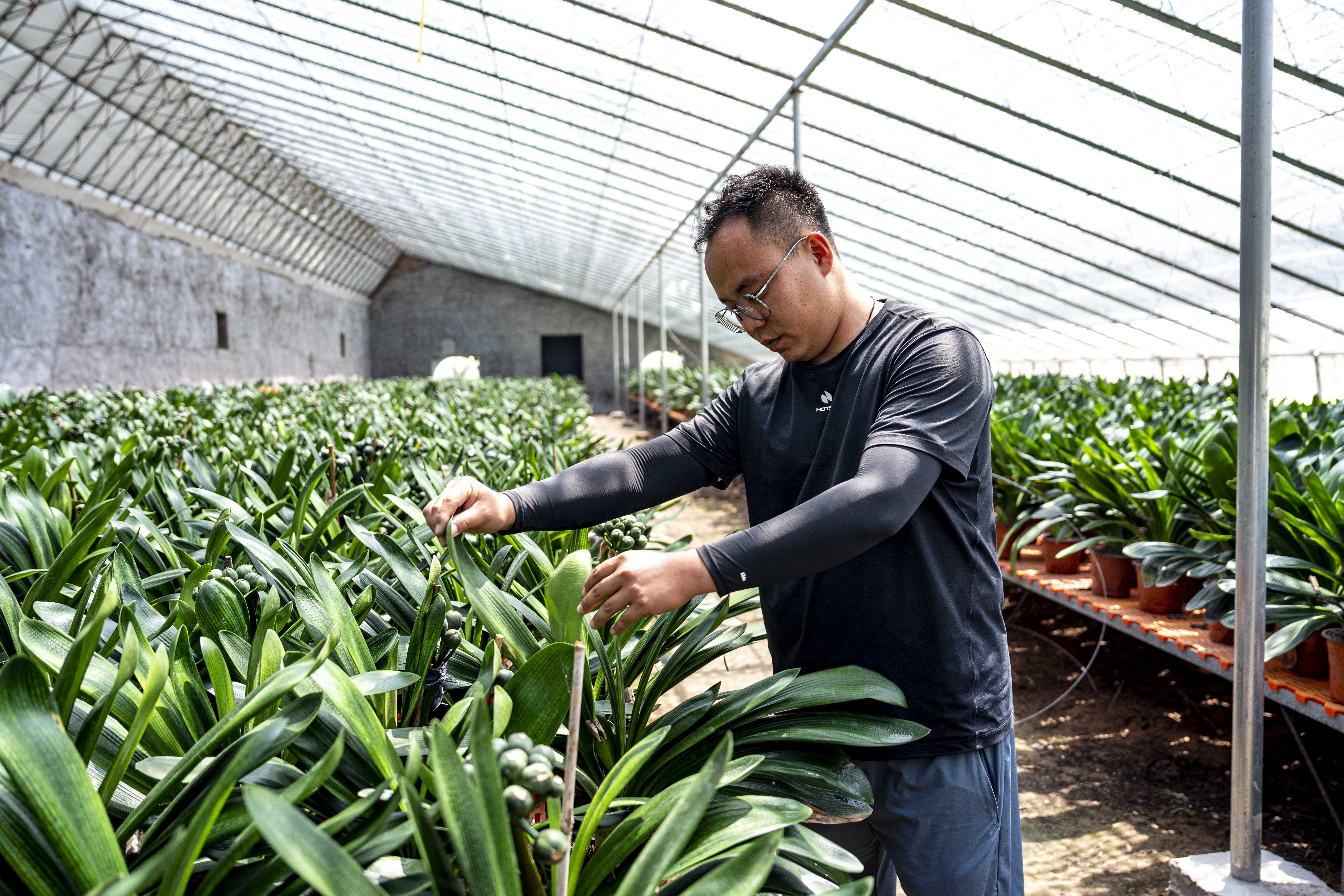 劉冠卿精心養(yǎng)護(hù)大棚中的君子蘭。人民網(wǎng) 盧鵬宇攝