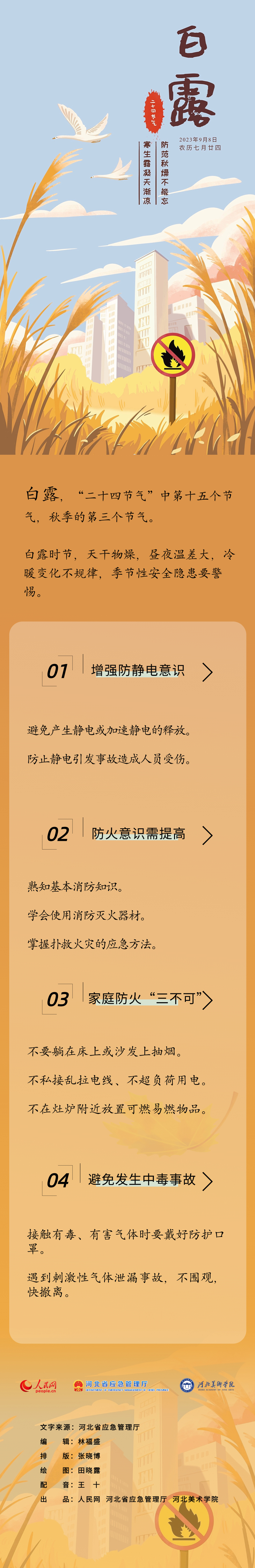 白露,“二十四節(jié)氣”中第十五個節(jié)氣,也是秋季的第三個節(jié)氣。白露時節(jié),天干物燥,晝夜溫差大,冷暖變化不規(guī)律,季節(jié)性安全隱患要警惕。近期,人民網與河北省應急管理廳共同推出二十四節(jié)氣安全海報。今天,和小編一起來了解白露時節(jié),有哪些安全避險小知識吧。