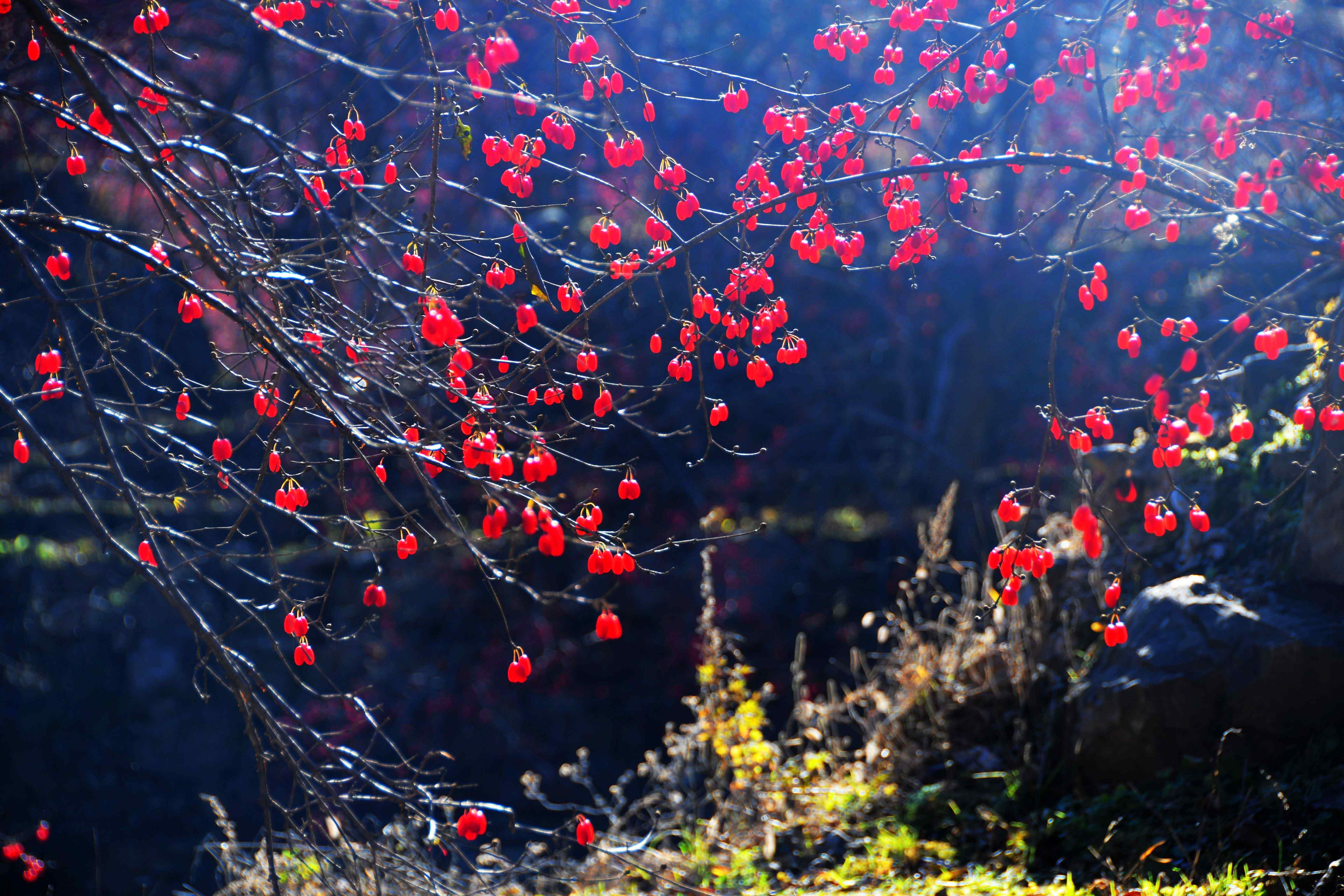 在所有秋色中,有一抹色彩來自漫山遍野的“茱萸紅”。道路旁、清泉邊、土丘上、河道旁,還有人們的院落四周,處處可見顆顆如紅瑪瑙般的山茱萸。