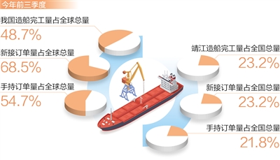 今年前三季度,我國造船完工量、新接訂單量和手持訂單量以載重噸計分別占全球總量的48.7%、68.5%和54.7%,均居世界第一。在江蘇泰州靖江市,當?shù)卦齑髽I(yè)的訂單排到了2026年,成為我國船舶業(yè)轉型升級、穩(wěn)步向好的縮影。