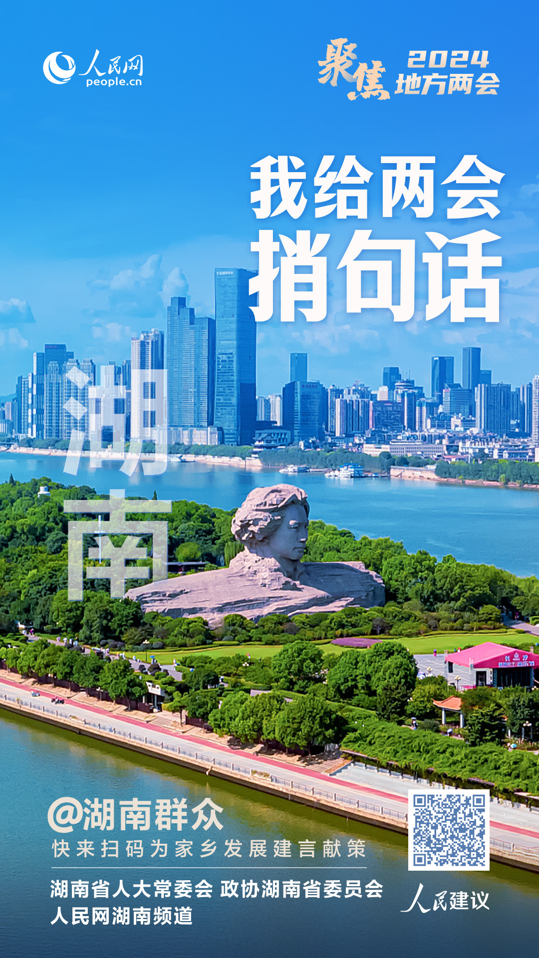 2024年1月23日,湖南省兩會召開。即日起,人民網(wǎng)聯(lián)合湖南人大常委會、政協(xié)湖南省委員會推出“我給湖南兩會捎句話”大型建言征集活動(簡稱“捎句話”活動),廣大網(wǎng)友可通過人民網(wǎng)“領(lǐng)導(dǎo)留言板”小程序、“人民網(wǎng)+”客戶端等渠道,為家鄉(xiāng)發(fā)展積極建言獻策。