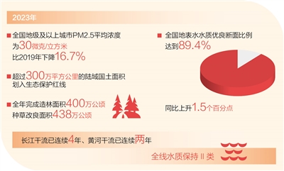 2023年,全國地級及以上城市PM2.5平均濃度為30微克/立方米,比2019年下降16.7%;全國地表水水質(zhì)優(yōu)良斷面比例達到89.4%,同比上升1.5個百分點;超過300萬平方公里的陸域國土面積劃入生態(tài)保護紅線。