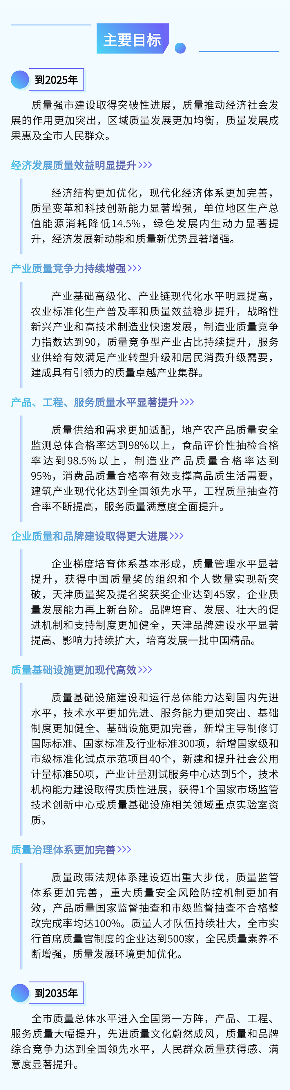 市市場(chǎng)監(jiān)管委相關(guān)負(fù)責(zé)人表示,《綱要》錨定“強(qiáng)市”定位,積極對(duì)標(biāo)先進(jìn)。綜合考量現(xiàn)實(shí)需求和發(fā)展趨勢(shì),立足“對(duì)標(biāo)先進(jìn)、領(lǐng)跑東部”,提出到2025年質(zhì)量強(qiáng)市建設(shè)取得突破性進(jìn)展的發(fā)展目標(biāo),明確制造業(yè)質(zhì)量競(jìng)爭(zhēng)力指數(shù)達(dá)到90,持續(xù)追趕質(zhì)量先進(jìn)省市;制造業(yè)產(chǎn)品質(zhì)量合格率達(dá)到95%,穩(wěn)步保持在全國(guó)前列。到2035年,進(jìn)一步在全國(guó)質(zhì)量工作格局中爭(zhēng)先進(jìn)位,提出天津市質(zhì)量總體水平進(jìn)入全國(guó)第一方陣、質(zhì)量和品牌綜合競(jìng)爭(zhēng)力達(dá)到全國(guó)領(lǐng)先水平等目標(biāo)愿景,充分展現(xiàn)天津奮力開(kāi)創(chuàng)全面建設(shè)社會(huì)主義現(xiàn)代化大都市新局面的決心和信心。