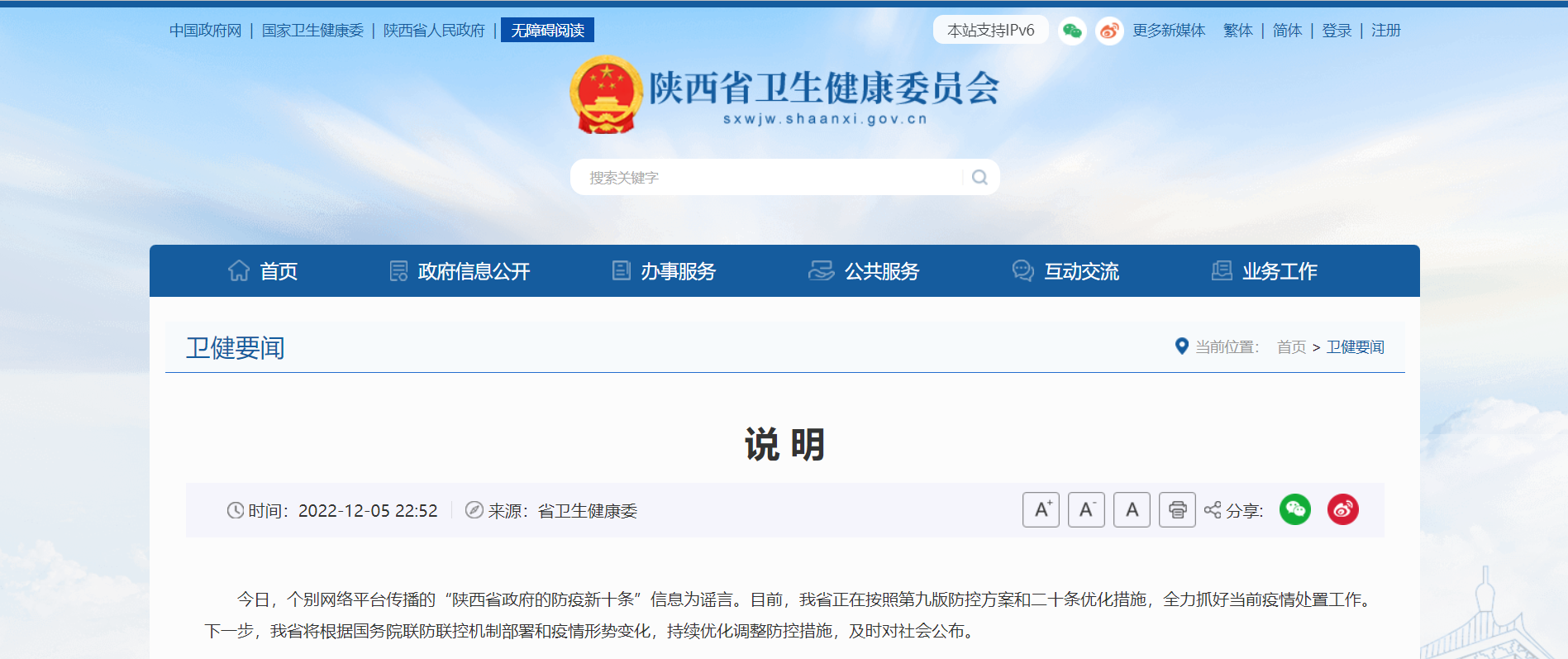 央廣網(wǎng)西安12月6日消息(見習記者侯凱奇)12月5日晚,陜西省衛(wèi)健委官網(wǎng)發(fā)布說明,明確提出個別網(wǎng)絡平臺傳播的“陜西省政府的防疫新十條”信息為謠言。