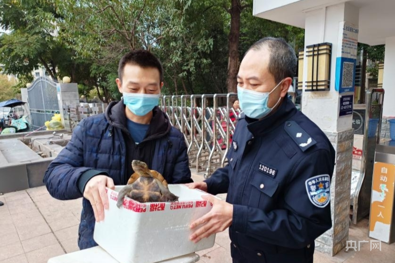 民警從魏先生手中接過(guò)野生草龜(央廣網(wǎng)發(fā) 龔軒攝)