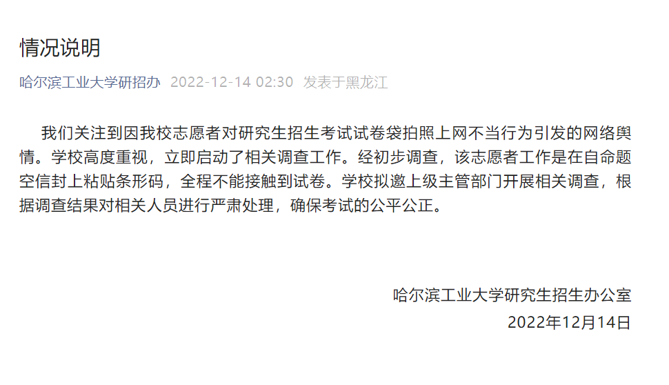 哈工大回應(yīng)志愿者拍考研試卷袋 擬邀上級主管部門調(diào)查