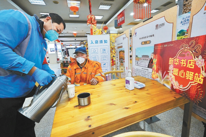 新華書店開設(shè)暖心驛站,為環(huán)衛(wèi)工人、快遞小哥等免費(fèi)提供熱水和休息場所。本報(bào)記者 程功攝