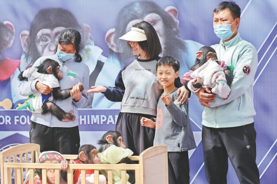 16日,北京野生動(dòng)物園在萌寶幼兒園戶外展區(qū)組織“明猩見面會(huì)”活動(dòng),邀約忠實(shí)粉絲與四只小黑猩猩互動(dòng)合影。本報(bào)記者 鄧偉攝